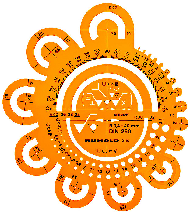 Die RUMOLD-Abrundungsschablone besitzt Radien von 0,4 – 40 mm in optimaler Abstufung nach DIN 250, zudem ist die Vorzugsreihe nach DIN unterstrichen. Die Radien 0,4 – 2 mm sind in Abstufung 0,1 mm, die Radien 2,5 – 40 mm sind zusätzlich mit Kreistangenten sowie Zentrumsbohrung und Achsenprägung. Die Abrundungsschablone hat einen Winkelmesser, ausgewählte Oberflächenzeichen nach DIN ISO 1302 und eine Tuschekante.