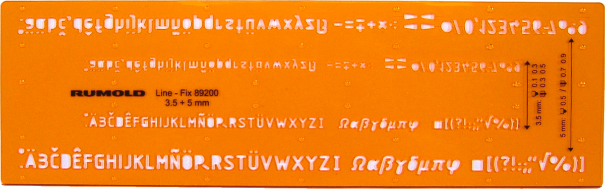 Diese Schriftschablone für Fineliner erlaubt ein sehr präzises Beschriften bei einer Schriftgrösse von 3,5 und 5,0 mm.