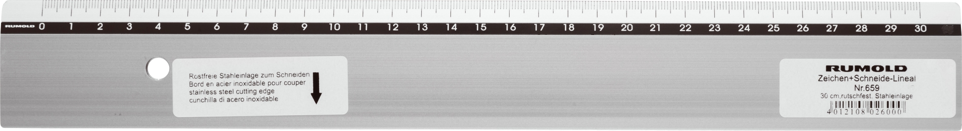 Präzisions-Zeichen- und Schneidelineal aus eloxiertem Aluminium, mit Tuschefacette und Aufhängeloch, rutschfest, augenschonende weisse Bezifferung auf schwarzem Band, Präzisions-mm-Skala auf Alu-Facette, rostfreie Stahleinlage für Schneidearbeiten.