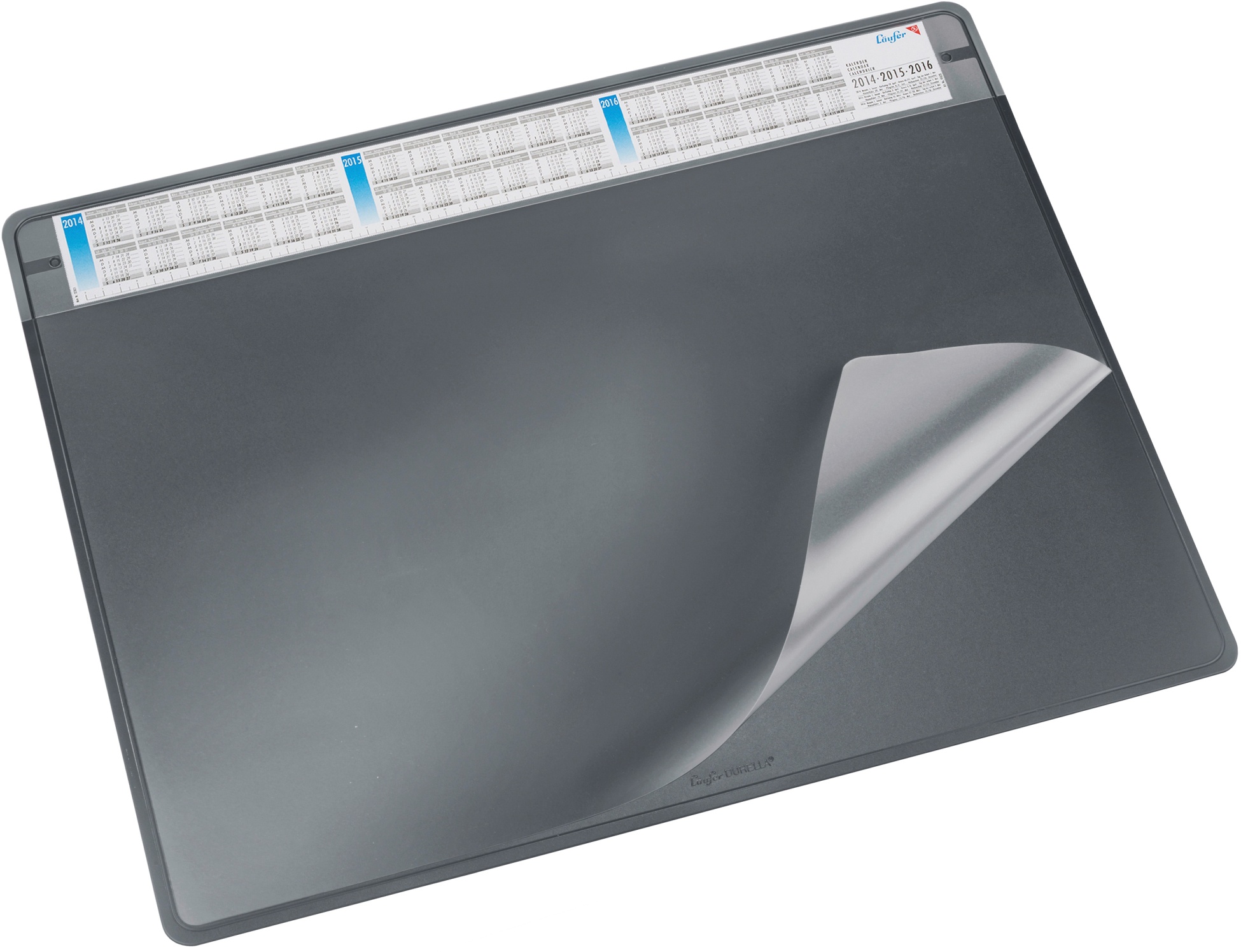 LÄUFER® Schreibunterlage Durella Soft aus PVC, abwaschbar, mit transparenter, auswechselbarer, blendfreier Klarsichtauflage, 3-Schichten-Aufbau, Schaumstoff/Vlies, Unterfolie und Deckfolie, langlebig, hohe Rutschfestigkeit, Kalendarium, vielseitig verwendbar, ideal für die Einlage von Unterlagen, die immer im Blickfeld und trotzdem geschützt sein sollen. Masse: B 650 x H 500 mm. Nachhaltigkeit eco:plus: recyclingfähig, recycelter Bestandteil, Recycelgehalt Abfall vor Gebrauch max. 75%, Recycelgehalt Abfall nach Gebrauch max. 99%. schwarz