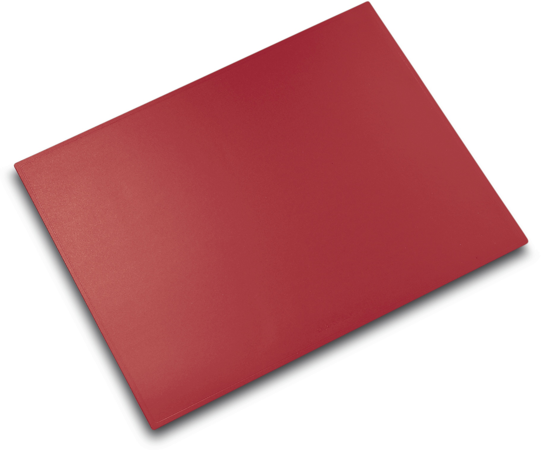 LÄUFER® Schreibunterlage Durella aus PVC, rutschfest, bruchsicher, liegt fest und flach, geruchlos und farbecht, mit feinem Zierrand. Nachhaltigkeit eco:plus: recyclingfähig, recycelter Bestandteil, Recycelgehalt Abfall vor Gebrauch max. 75%, Recycelgehalt Abfall nach Gebrauch max. 99%. 650 x 520 mm rot