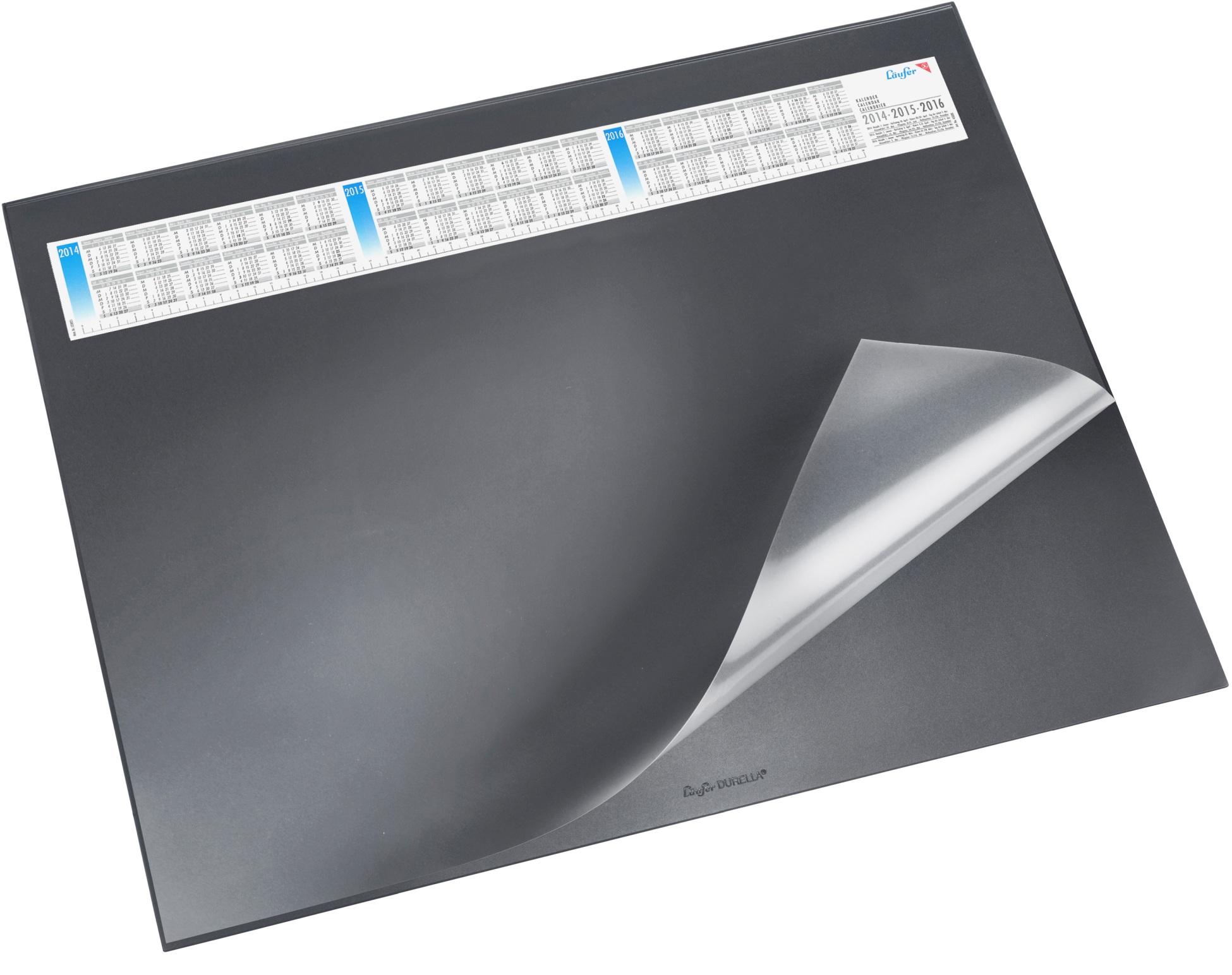 LÄUFER® Schreibunterlage Durella DS aus PVC, mit transparenter, an einer Längsseite fest verschweisster Vollsichtfolie, Kalendarium, vielseitig verwendbar, ideal für die Einlage von Unterlagen, die immer im Blickfeld und trotzdem geschützt sein sollen. Nachhaltigkeit eco:plus: recyclingfähig, recycelter Bestandteil, Recycelgehalt Abfall vor Gebrauch max. 75%, Recycelgehalt Abfall nach Gebrauch max. 99%. 650 x 520 mm schwarz