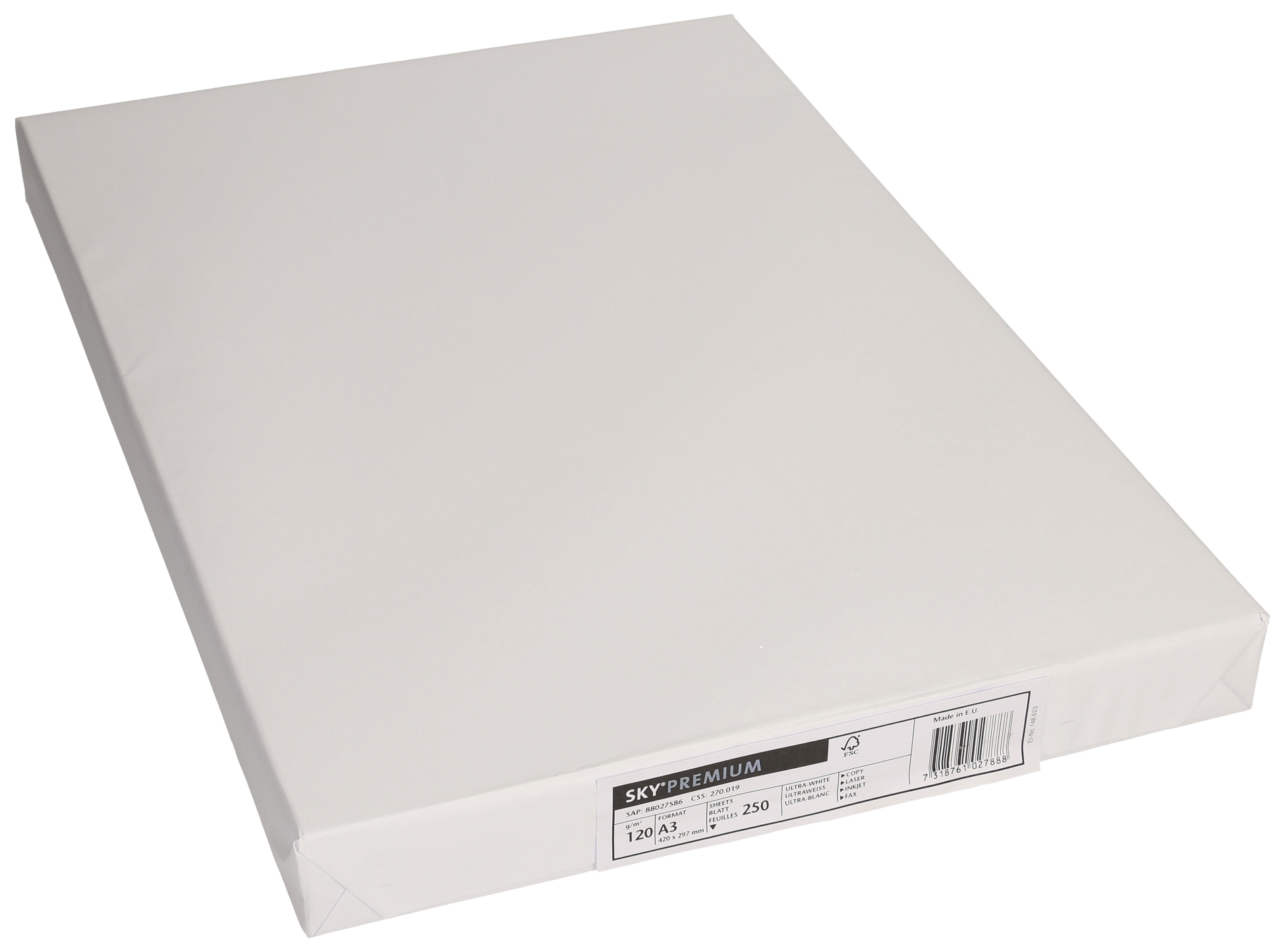 SKY® PREMIUM Universalpapier FSC, hochweiss Premium Papier für höchste Ansprüche, elementarchlor- und holzfrei, wieder verschliessbare Packung. Weissegrad: 170 CIE. Geeignet für Kopierer, Laser-/Inkjetdrucker und Farblaserdrucker/-kopierer. Nachhaltigkeit eco:plus: kompostierbar, abbaubar, recyclingfähig, umweltfreundliche Verpackung. Nachhaltigkeit eco:plus: kompostierbar, abbaubar, recyclingfähig, umweltfreundliche Verpackung. Zertifikat: FSC. Packung zu 250 Blatt A3 120 g/m2
