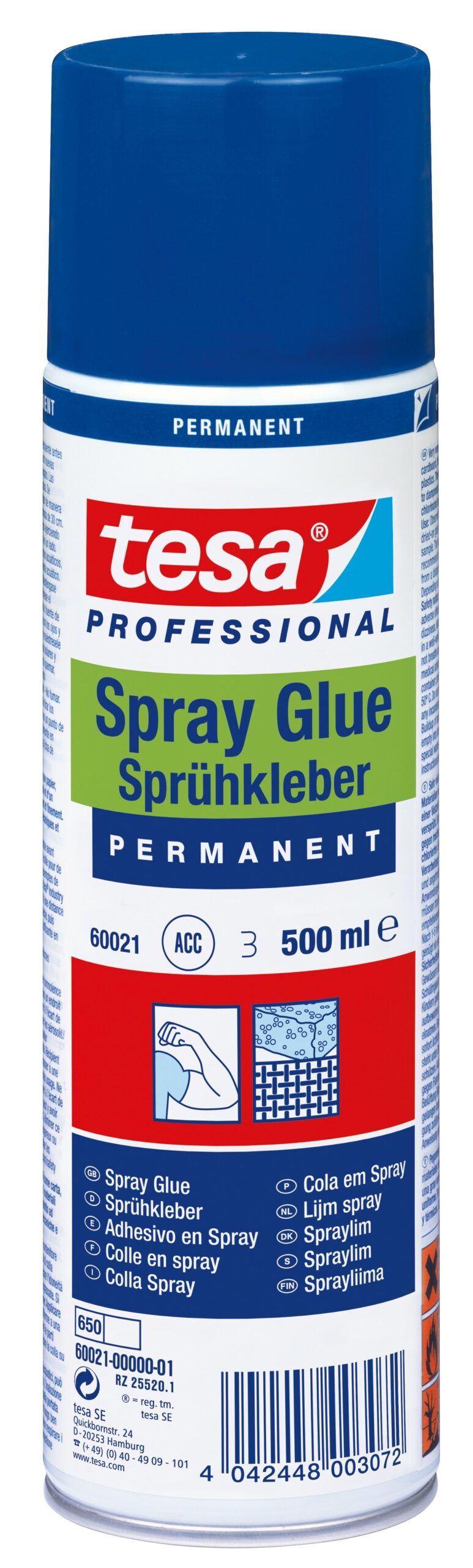 TESA® Sprühkleber ideal zur permanenten Verklebung von unterschiedlichen Materialien wie Papier, Karton, Filz, Folie, Holz, Leder, Styropor und Kunststoffe, feuchteresistent, temperaturbeständig bis +60°C. 500 ml