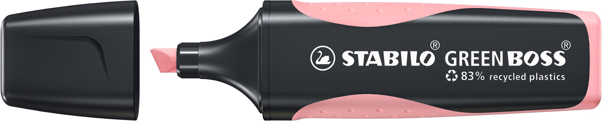 STABILO® BOSS® Textmarker GREEN Universaltinte auf Wasserbasis, 4 Std. Austrocknungsschutz, aus 83% recyceltem PP, nachfüllbar, Strichbreite ca. 2 – 5 mm. Nachhaltigkeit eco:plus: recycelter Bestandteil, Recycelgehalt Abfall vor Gebrauch max. 83%, umweltfreundliche Verpackung. rosy rouge
