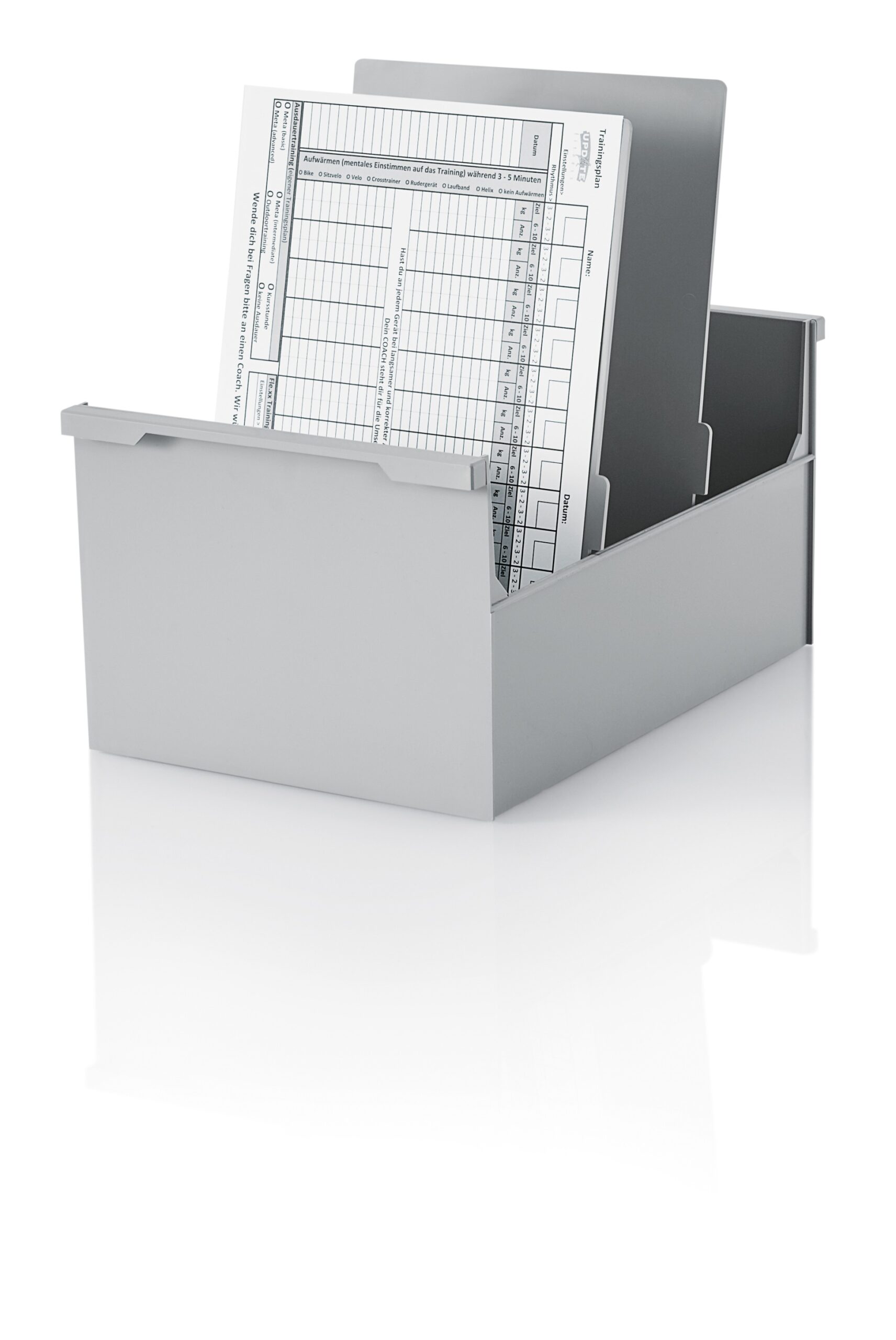 STYRO Oeko Karteikasten ohne Deckel aus 100% PS-Regenerat, inkl. 2 Schwenkplatten, Fassungsvermögen ca. 800 Karten. Nachhaltigkeit eco:plus: verlängertes Produktleben, recyclingfähig, recycelter Bestandteil, Recycelgehalt Abfall vor Gebrauch max. 80%, Recycelgehalt Abfall nach Gebrauch max. 80%, Abfallminderung, umweltfreundliche Verpackung. Zertifikat: Der Blaue Engel. für Format A4 hoch grau 230 x 175 x 345 mm