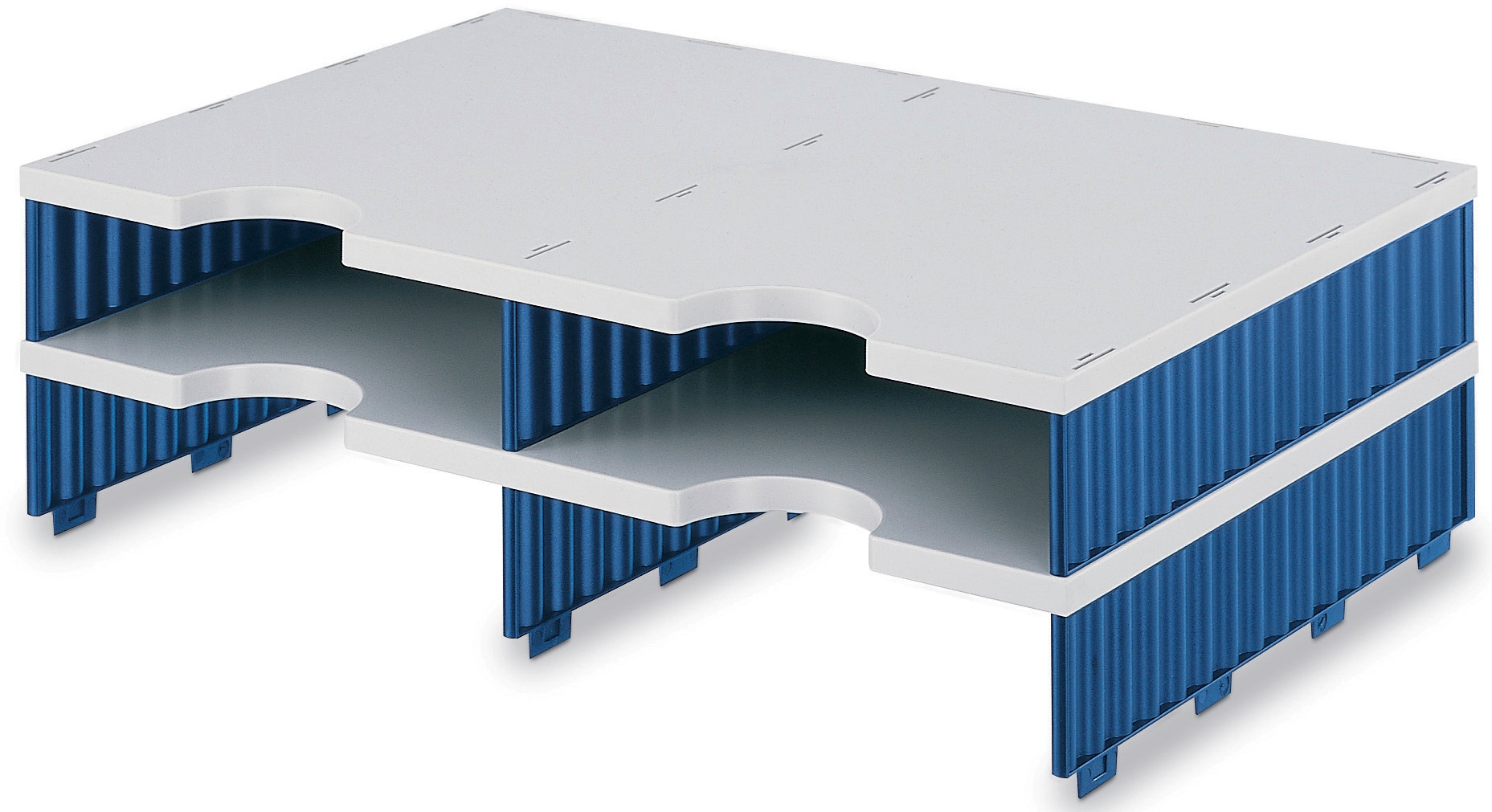 STYRODOC Dokumentenablage duo aus PS, Alternative zur Schubladenbox, viele Kombinationsmöglichkeiten, vielseitig einsetzbar, freistehend auf dem Schreibtisch, als Monitorhalter, in Regalen oder Schränken sowie als Drucker- oder Faxstation, lässt sich einfach zusammenstecken, erweiterbar, sehr stabil, Griffmulde für leichte Entnahme, inkl. Beschriftungsmaterial, 2 Fächerhöhen. Aussenmasse: B 485 x T 331 mm. Standard-Fachhöhe innen: 57 mm. Jumbo-Fachhöhe innen: 127 mm. Aufbaueinheit Standardhöhe, 2 Etagen/4 Fächer Seitenteile blau Boden hellgrau