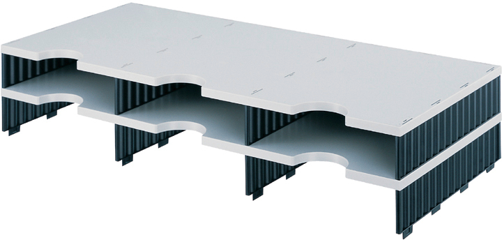 STYRODOC Dokumentenablage trio aus PS, Alternative zur Schubladenbox, viele Kombinationsmöglichkeiten, lässt sich einfach zusammenstecken, erweiterbar, sehr stabil, Griffmulde für leichte Entnahme, inkl. Beschriftungsmaterial. Aussenmasse: B 723 x T 331 mm. Standard-Fachhöhe innen: 57 mm. Jumbo-Fachhöhe innen: 127 mm. Aufbaueinheit Standardhöhe, 2 Etagen/6 Fächer Boden hellgrau, Seitenteile schwarz