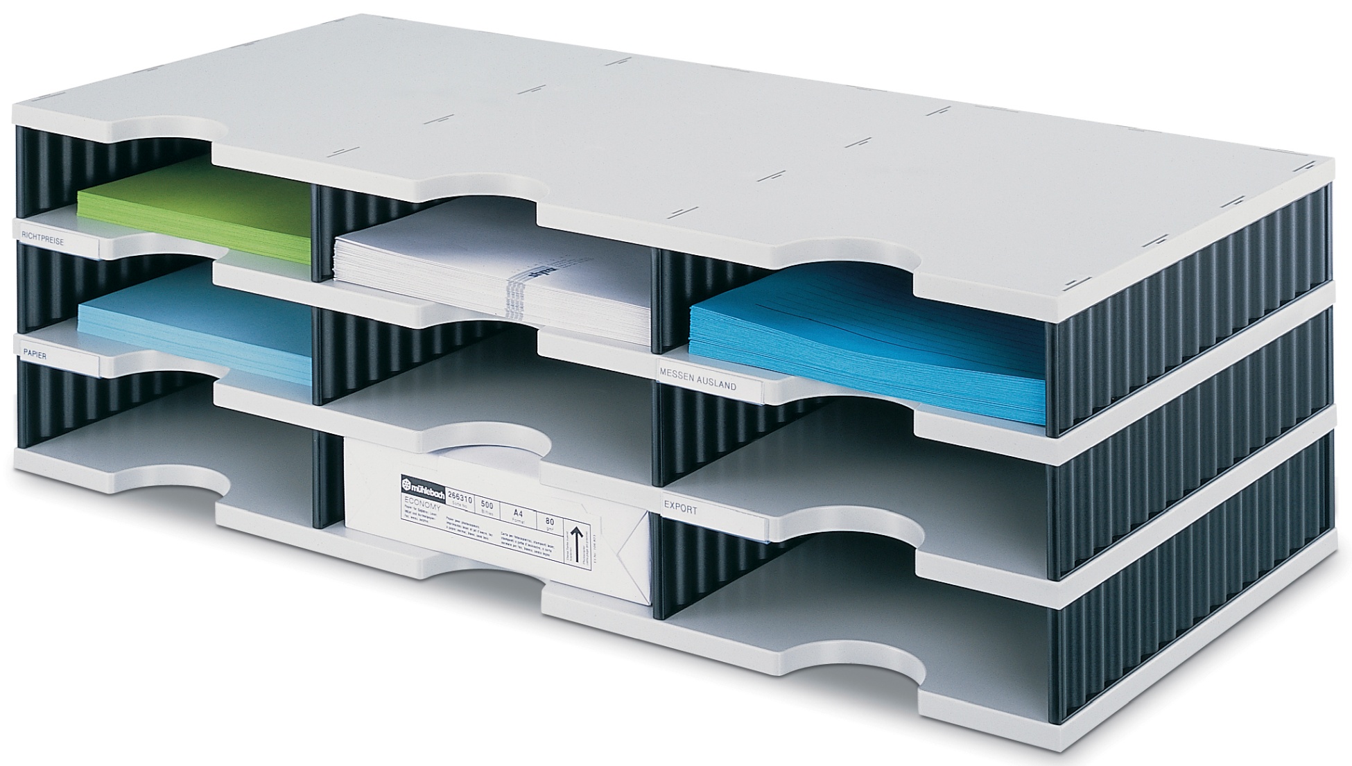 STYRODOC Dokumentenablage trio aus PS, Alternative zur Schubladenbox, viele Kombinationsmöglichkeiten, lässt sich einfach zusammenstecken, erweiterbar, sehr stabil, Griffmulde für leichte Entnahme, inkl. Beschriftungsmaterial. Aussenmasse: B 723 x T 331 mm. Standard-Fachhöhe innen: 57 mm. Jumbo-Fachhöhe innen: 127 mm. Grundeinheit Standardhöhe, 3 Etagen/9 Fächer Seitenteile schwarz Boden hellgrau