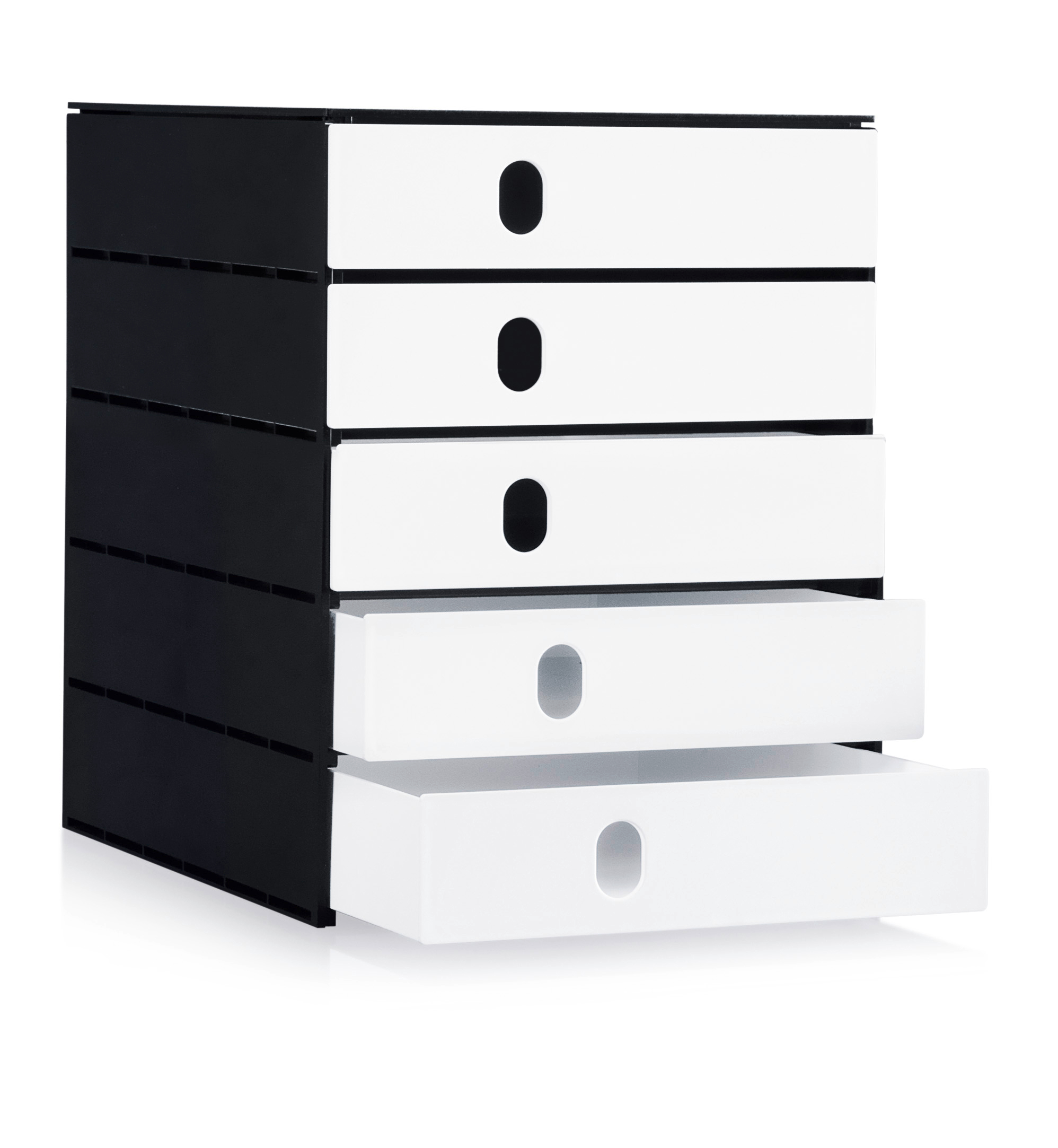 STYROVAL PRO Schubladenelement black & white Xtra-slim aus 60% PS-Regenerat und 40% PS, passend für Metallmöbel und Regale, inkl. Beschriftungsmaterial, für Format C4. Aussenmasse: B 243 x T 335 mm. Nachhaltigkeit eco:plus: verlängertes Produktleben, recyclingfähig, recycelter Bestandteil, Recycelgehalt Abfall vor Gebrauch max. 60%, Recycelgehalt Abfall nach Gebrauch max. 80%, Abfallminderung, umweltfreundliche Verpackung. 5 hohe, geschlossene Schubladen, 49 mm hoch Gehäuse Schubladen schwarz weiss H 323 mm