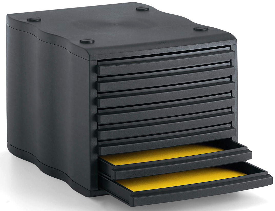 STYROWAVE Schubladenelement das Ordnungssystem im Baukastenprinzip: stabil – formschön – modern, Gehäuse aus schlagfestem PS (schwarz und grau in Regenerat), für Format A4/C4. Aussenmasse: B 270 x H 240 x T 355 mm. Nachhaltigkeit eco:plus: verlängertes Produktleben, recyclingfähig, recycelter Bestandteil, Recycelgehalt Abfall vor Gebrauch max. 70%, Recycelgehalt Abfall nach Gebrauch max. 80%, Abfallminderung. Zertifikat: Der Blaue Engel. 8 geschlossenen Schubladen Gehäuse Schubladen schwarz schwarz