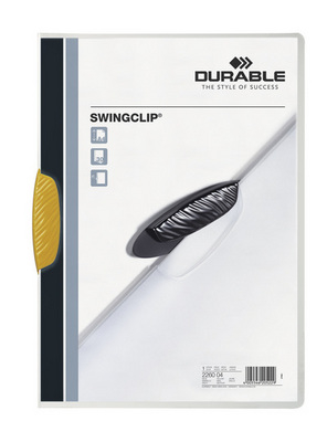 DURABLE Klemmhefter Swingclip® aus transparenter, flexibler Hartfolie PP, farbige, elipsenförmige, seitlich schwenkbare Kunststoffklemme, Fassungsvermögen bis 30 Blatt 80 g/m2, für Format A4. Nachhaltigkeit eco:plus: recyclingfähig. gelb