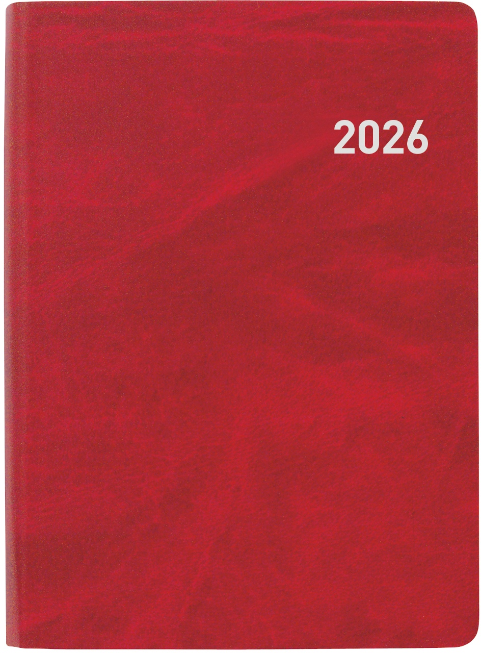 BIELLA Taschenagenda Memento 1 Woche auf 2 Seiten, Kalendarium viersprachig d/f/i/gb, querliniert, zusätzliche Jahres-, Monatsseiten, Notizseiten perforiert, Doppelseite mit Monatsübersicht und Notizfeld, auswechselbares Adressenregister, Eckenperforation, Format 10,1 x 14,2 cm. Nachhaltigkeit eco:plus: Zertifikat: FSC. Einband aus Kunstleder, farbig marmoriert rot Jahrgang 2026
