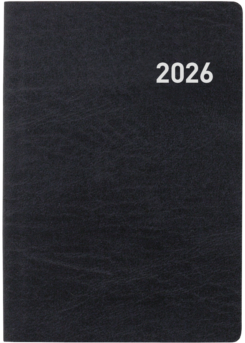 BIELLA Taschenagenda Tell 2 Tage pro Seite, Sa. + So. auf 1/2 Seite, Kalendarium viersprachig d/f/i/gb, querliniert, zusätzliche Jahres-, Monats- und Notizseiten, auswechselbares Adressenregister, Eckenperforation, Format 8,5 x 12,5 cm. Nachhaltigkeit eco:plus: Zertifikat: FSC. Einband aus Kunstleder, farbig marmoriert schwarz Jahrgang 2026