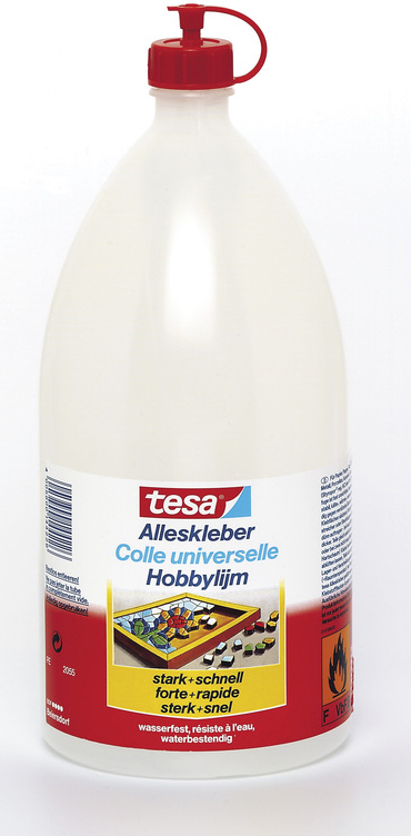 TESA® Alleskleber flüssiger Alleskleber, kraftvoll und schnell. Kälte- und wärmefest, lichtecht, alterungsbeständig, wasserfest, wellt kein Papier, ideal für Punkt- und Flächenkleben, klebt farblos transparent Papier, Fotos, Filz, Stoff, Kork, Leder, Holz, Metall usw. Nachfüllflasche 1750 g