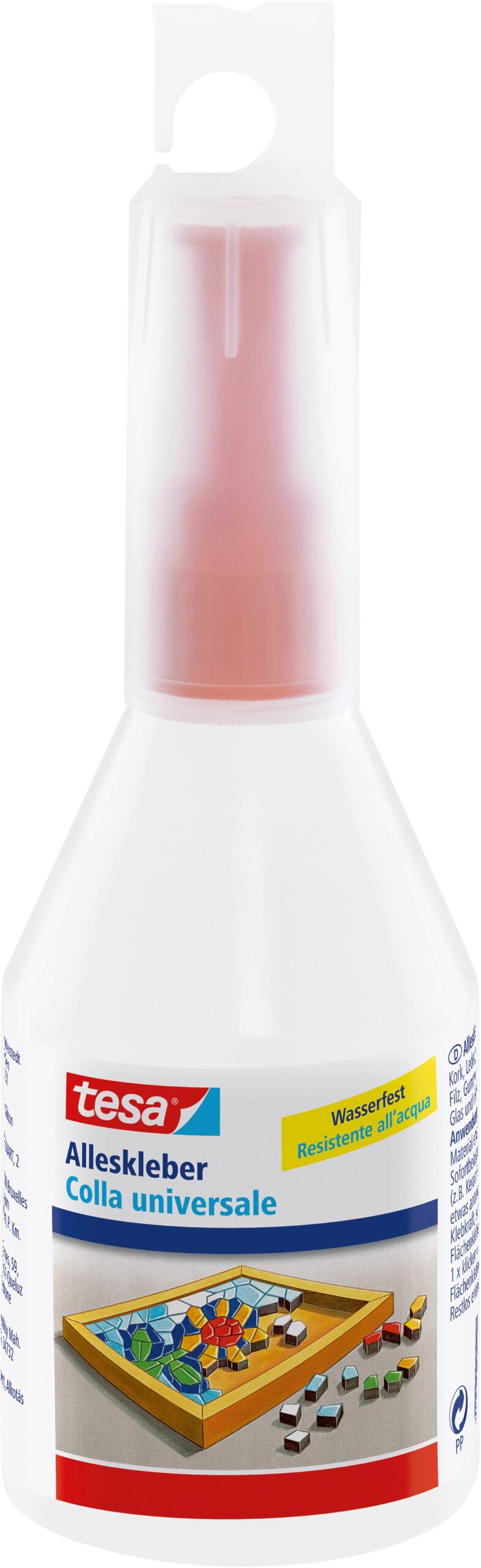 TESA® Alleskleber flüssig, kraftvoll und schnell, kälte- und wärmefest, lichtecht, alterungsbeständig, wasserfest, Papier wellt nicht, ideal für Punkt- und Flächenkleben, farblos transparent, klebt Papier, Fotos, Filz, Stoff, Kork, Leder, Holz, Metall usw. 90 g