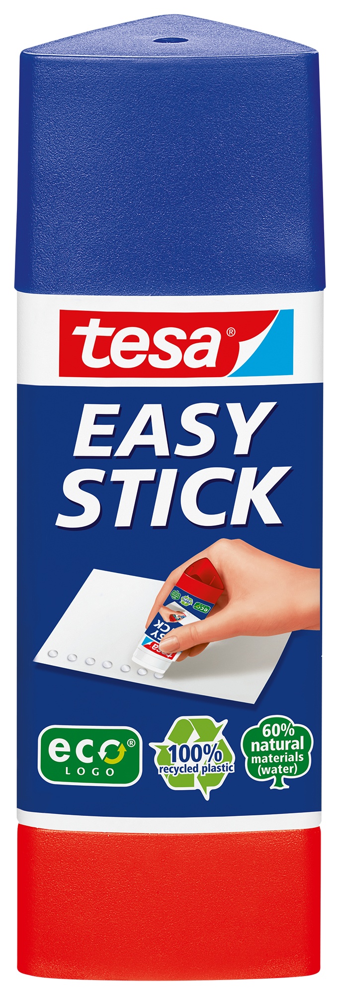 TESA® Klebestift Easy Stick ecoLogo® klebt schnell, kalt auswaschbar, genaue Kanten-, Linien- und Punktverklebung, klebt Papier, Karton, Fotos, Stoff, Filz und Kork, lösungsmittelfrei, Gehäuse aus 100% recyceltem Kunststoff, 65% biobasierter Klebstoff. Nachhaltigkeit eco:plus: recyclingfähig, recycelter Bestandteil, umweltfreundliche Verpackung. 12 g