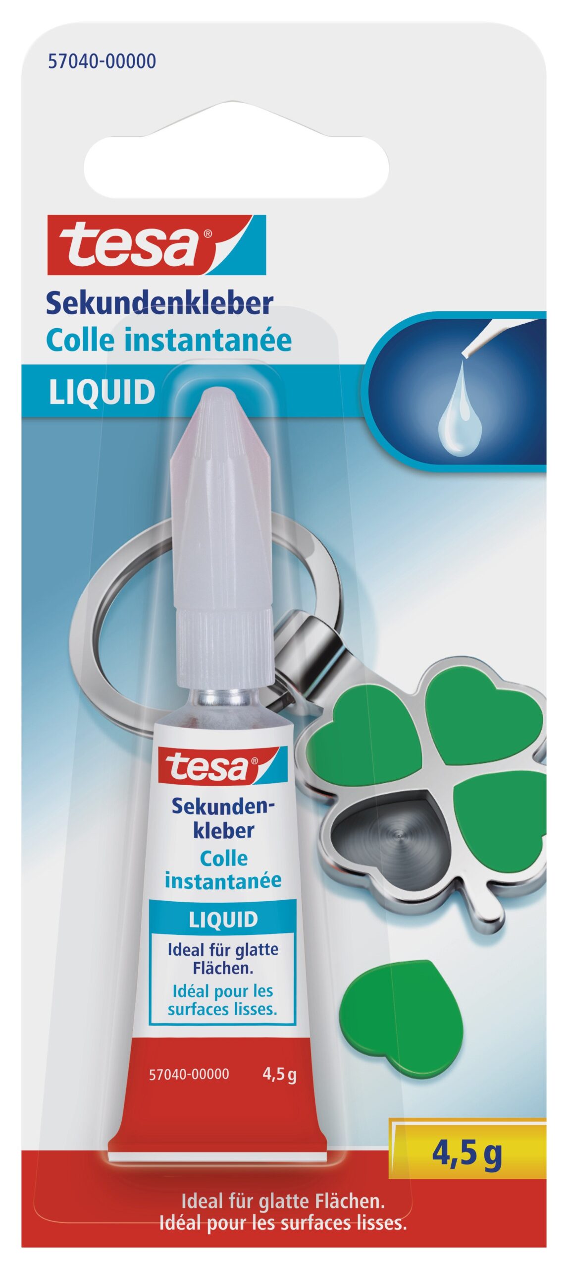 TESA® Sekundenkleber flüssig ideal für Schnellreparaturen von kleinen, glatten Flächen, hohe Wasser-, Kälte- und Hitzebeständigkeit. 4,5 g