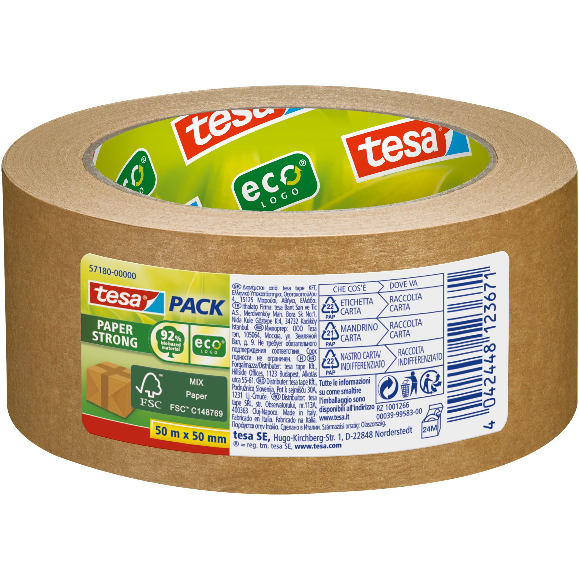 TESA® Papier-Verpackungsband ecoLogo® braun, Rollenkern aus 100% Recyclingkarton, 60% biobasiertes Material, starke Klebkraft und reissfest, aber von Hand einreissbar, mit Synthesekautschuk-Klebmasse, zum sortenreinen Verschliessen von Umschlägen, Schachteln und Paketen, lösungsmittelfrei. Nachhaltigkeit eco:plus: recyclingfähig, recycelter Bestandteil. 50 mm x 50 m