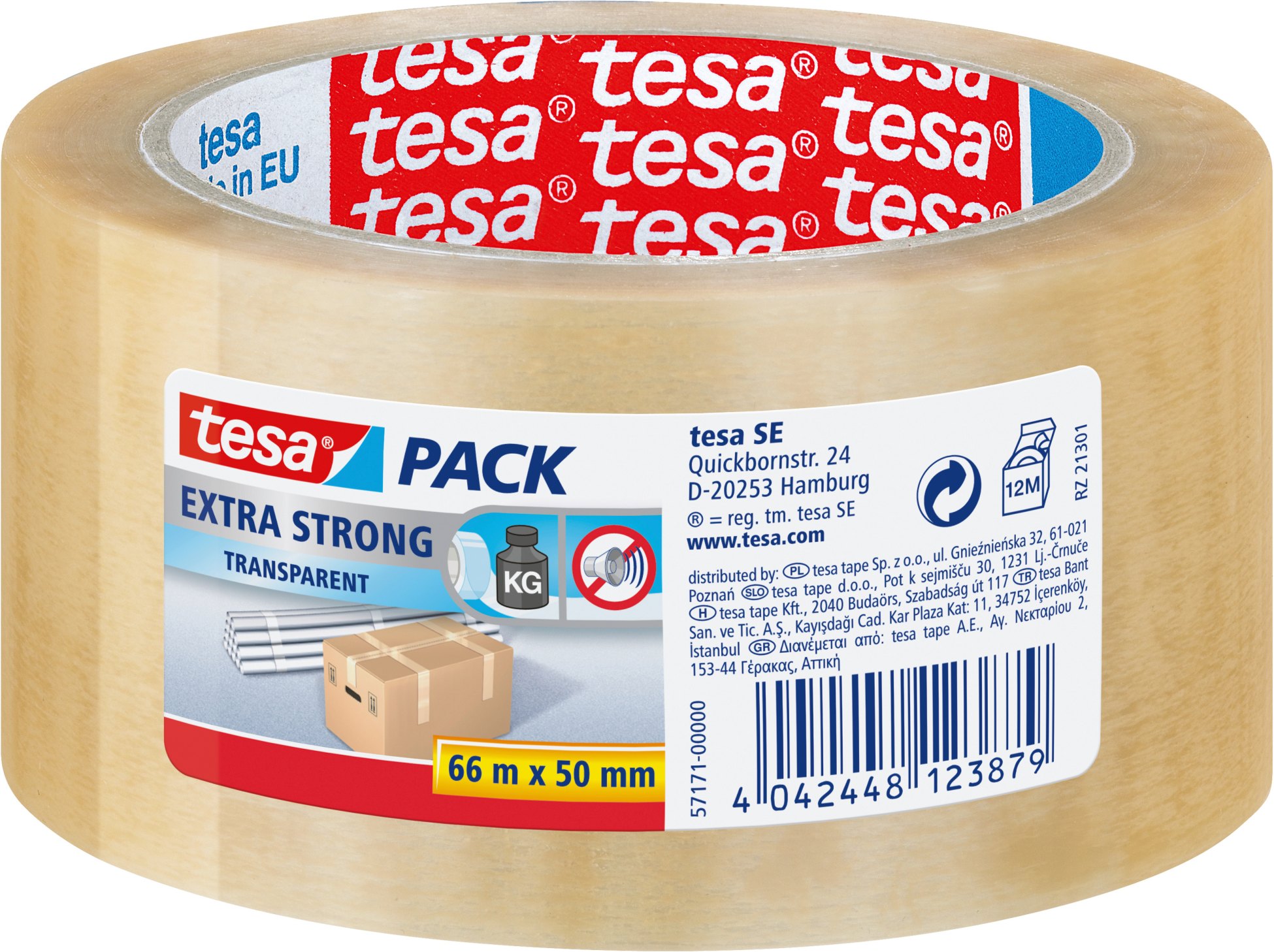 TESA® Verpackungsband PVC extra strong mit Naturkautschuk-Klebmasse, starke Klebkraft, reissfest, für schwere bis mittelschwere Pakete, gleichmässig und leise abrollbar. 50 mm x 66 m transparent