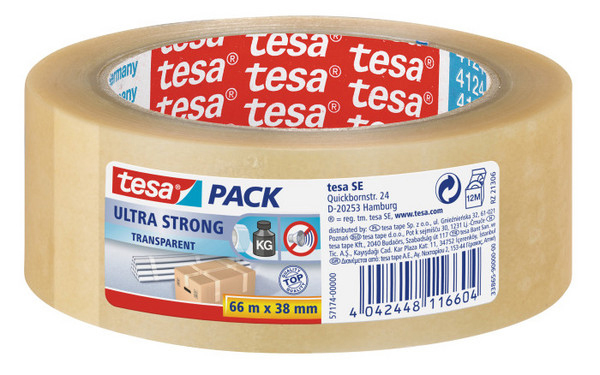 TESA® Verpackungsband PVC ultra strong mit Naturkautschuk-Klebmasse, sehr starke Klebkraft, extrem reissfest, für schwere bis mittelschwere Pakete, gleichmässig und leise abrollbar. 38 mm x 66 m transparent