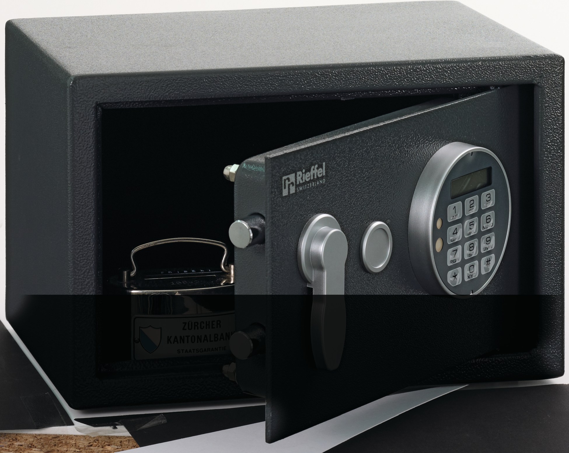 RIEFFEL® Security Box aus Stahl, dunkelgrau, einwandiger Gehäuse- und Tür-Aufbau, Türstärke 4 mm, Tür-Verriegelung mit 1-seitigem Hintergreifbolzen, Verschlussbolzen 15 mm stark, innenliegende Türscharniere, 4 Rückwand- und 4 Boden-Verankerungslöcher, Elektronikschloss VT-SE (15 mm vorstehend), mit mechanischer Notöffnung, 2 Notöffnungsschlüssel, Batteriebetrieb 4 x AA (mitgeliefert). 200SE Masse: B 310 x H 200 x T 200 mm. Gewicht: 7 kg.