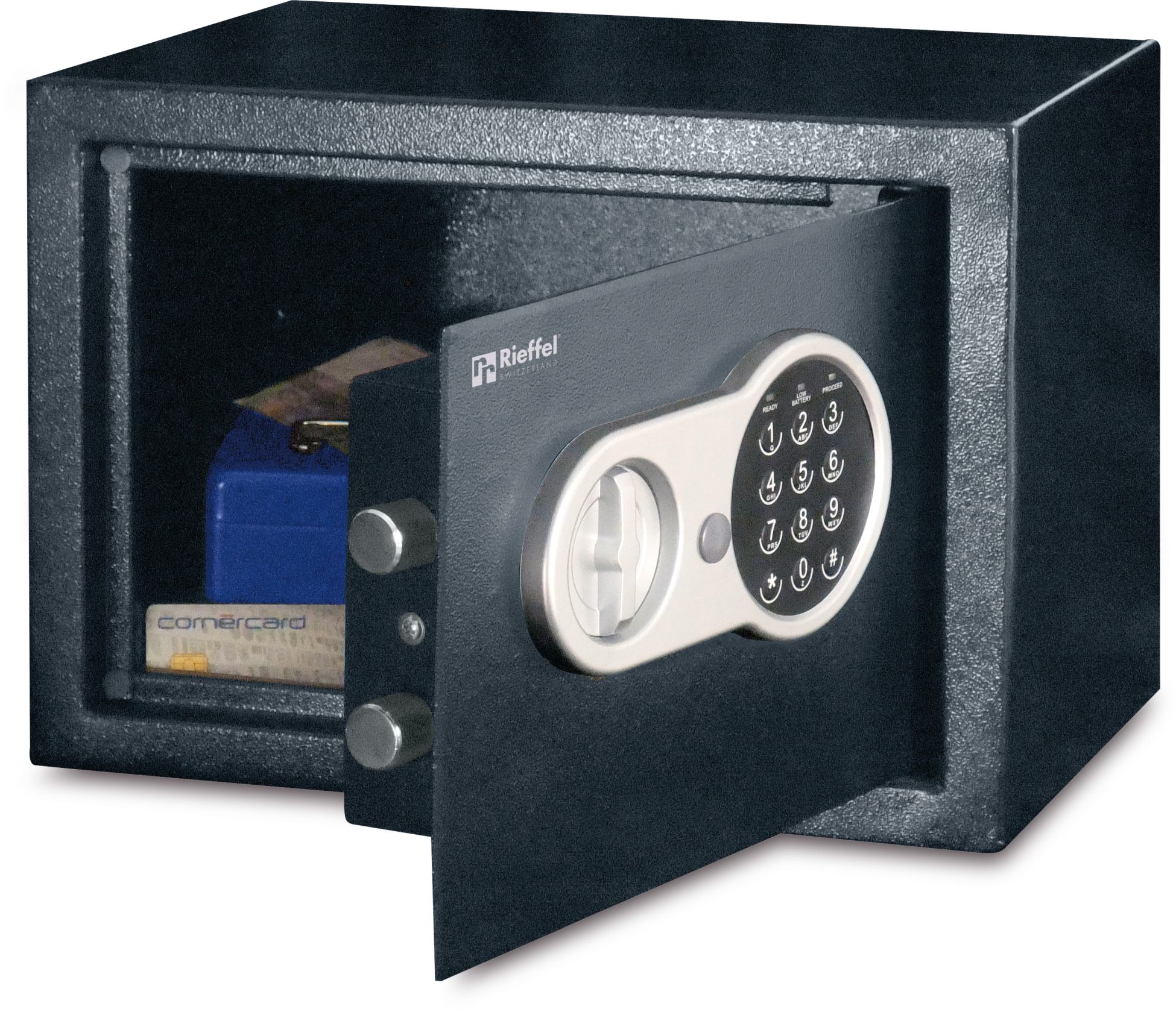 RIEFFEL® Security Box HGS Gehäuse einwandig aus Stahl, Rückwand- und Boden-Verankerungslöcher, Elektronikschloss, grosse, leicht lesbare Tastatur mit mechanischer Notöffnung, 2 Notöffnungsschlüssel, Batteriebetrieb (im Lieferumfang enthalten). HGS-16 E Masse: B 350 x H 250 x T 250 mm. Gewicht: 6 kg. schwarz