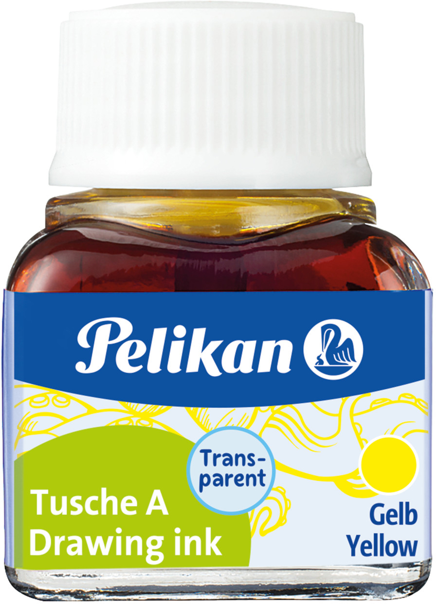 PELIKAN Tusche A für Beruf, Kunst, Schule und Hobby, zum Zeichnen und Malen, keine Tätowierfarbe, radier- und wasserfest, deckend, lichtecht, besonders geeignet für Reissfeder, Zeichenfeder und Pinsel. Flasche zu 10 ml gelb