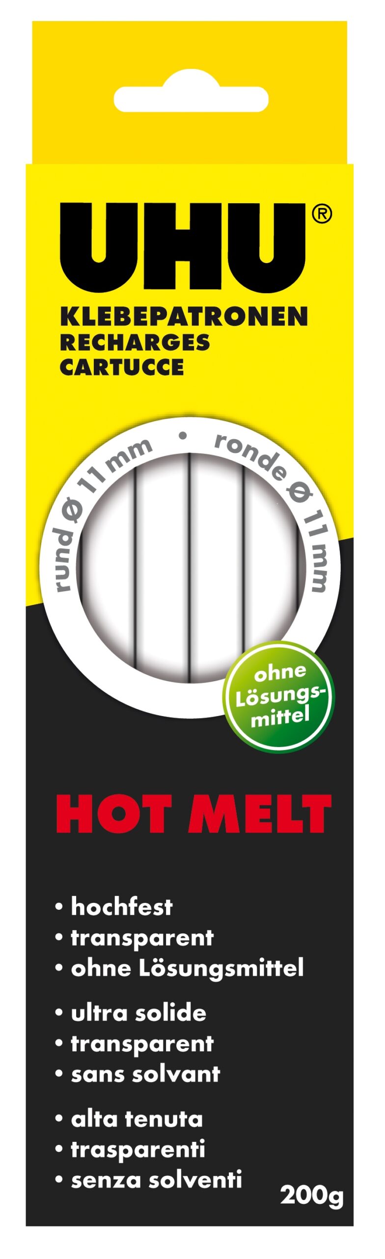 Die transparenten und hochfesten UHU Klebepatronen HOT MELT, mit einem Durchmesser von 11 mm, eignen sich zum Heimwerken, Reparieren, Fixieren, Abdichten und Isolieren in Verbindung mit allen klebbaren Materialien.