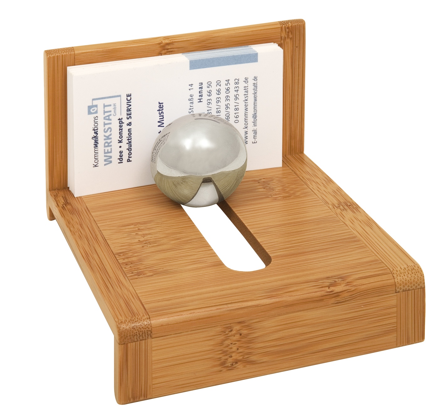 WEDO Visitenkartenhalter mit Stahlkugel, aussergewöhnliches Accessoire aus der Bambus-Schreibtischgarnitur. Bambus wird als schnell nachwachsender Rohstoff nicht nur ökologischen Aspekten gerecht, sondern strahlt auch Wärme und Eleganz aus. Das moderne Design wird durch die trendige Materialkombination zusätzlich unterstrichen.
