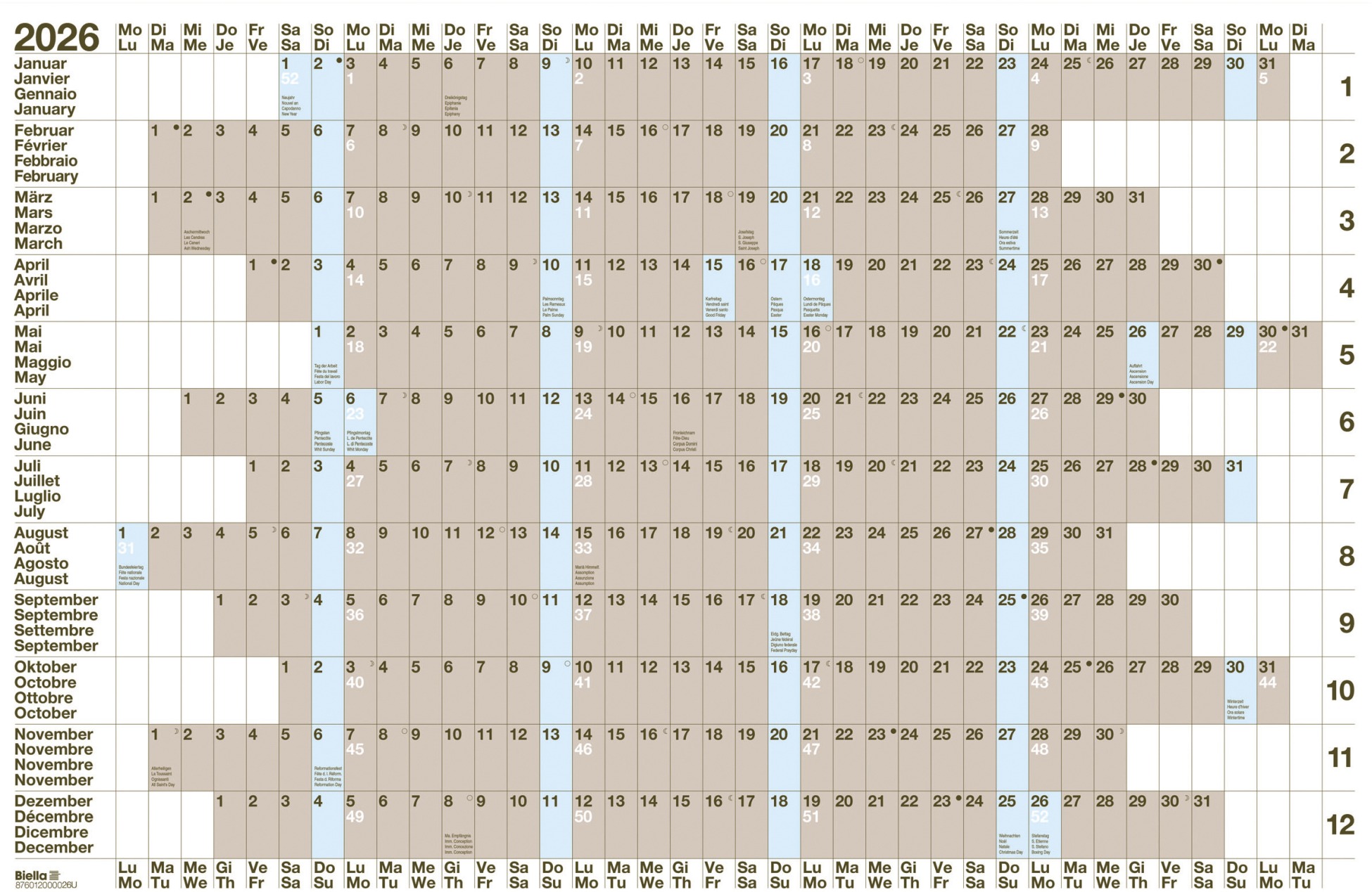 BIELLA Jahres-Wandplaner 1 Jahr pro Blatt, aus Papier, weiss, Tagesfelder mit Notizraum. Nachhaltigkeit eco:plus: Zertifikat: FSC. 69,5 x 46 cm d/f/i/gb Jahrgang 2026