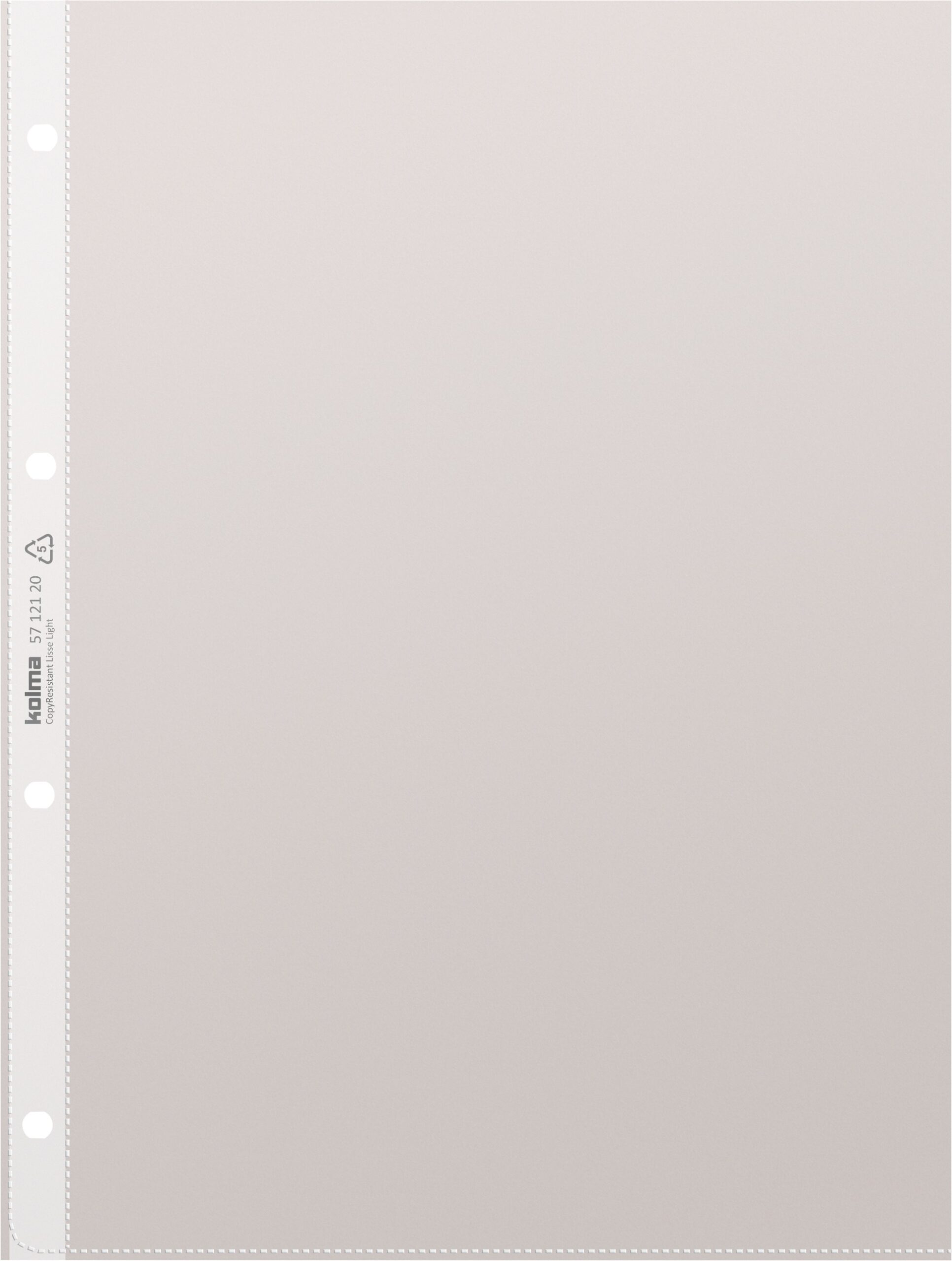 KOLMA Zeigebuchtaschen CopyResistant Lisse aus hochtransparentem PP CopyResistant Lisse, glänzende Oberfläche, dauerhaft und langlebig, hohe Reissfestigkeit, dokumentenecht, für Einlagen wie Kopien, Ausdrucke, Manuskripte etc., mit verstärktem Lochrand, ovale Lochung für müheloses Umblättern. Nachhaltigkeit eco:plus: verlängertes Produktleben, recyclingfähig, Recycelgehalt Abfall nach Gebrauch max. 100%. Light, 60 Micron, mit weissem Lochrand A4 4 Loch 100 Stück
