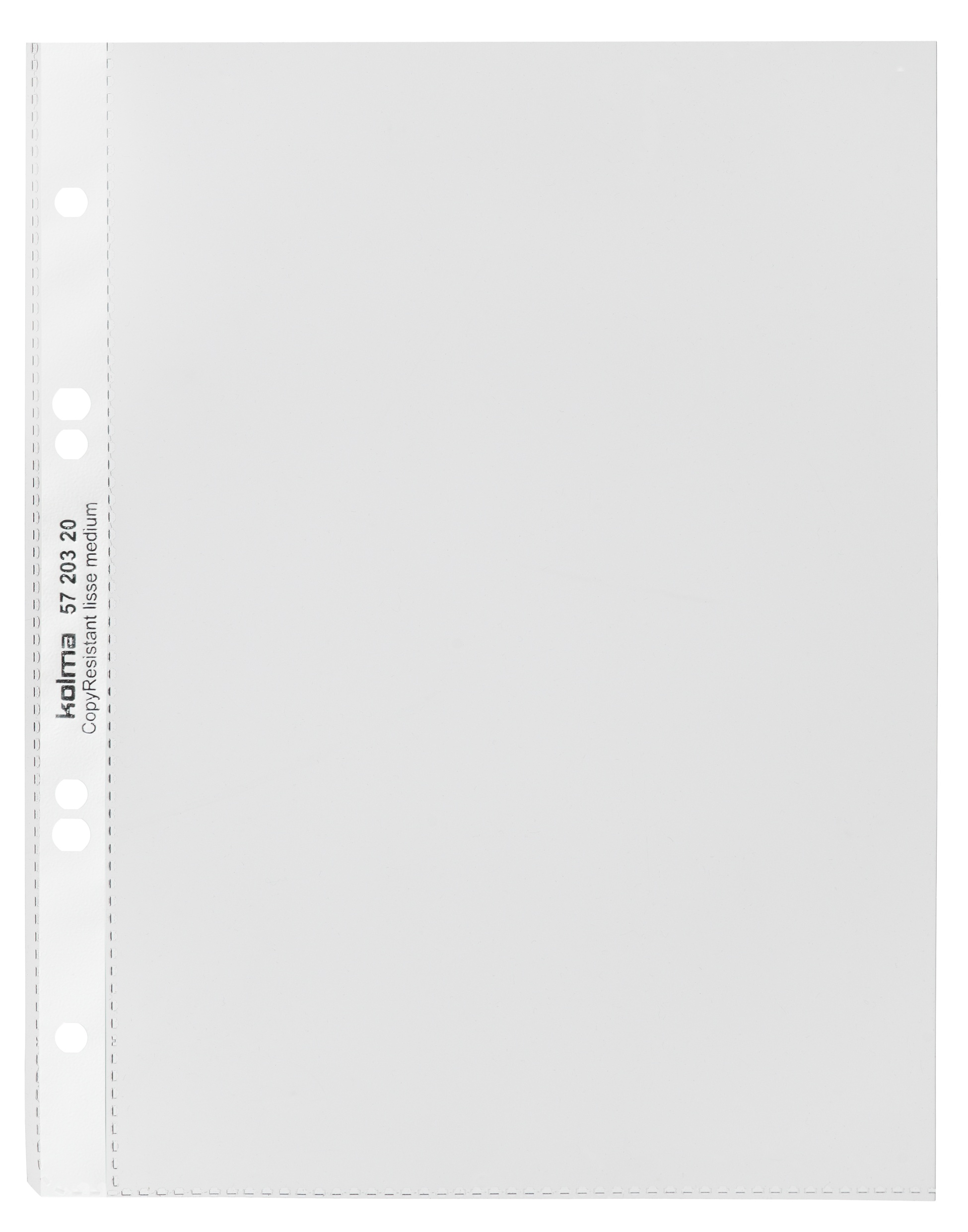 KOLMA Zeigebuchtaschen CopyResistant Lisse aus hochtransparentem PP CopyResistant Lisse, glänzende Oberfläche, dauerhaft und langlebig, hohe Reissfestigkeit, dokumentenecht, für Einlagen wie Kopien, Ausdrucke, Manuskripte etc., mit verstärktem Lochrand, ovale Lochung für müheloses Umblättern. Nachhaltigkeit eco:plus: verlängertes Produktleben, recyclingfähig, Recycelgehalt Abfall nach Gebrauch max. 100%. Medium, 80 Micron, mit weissem Lochrand A5 Universallochung 100 Stück